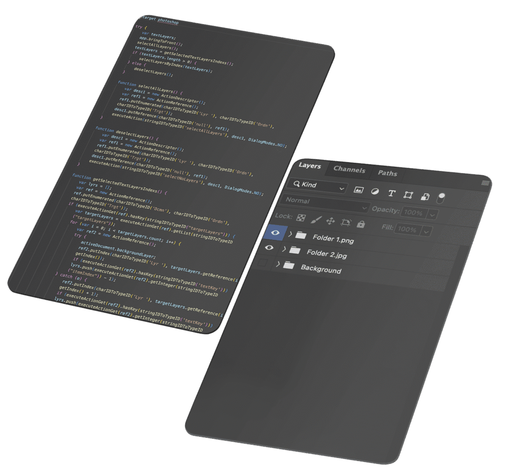 Nuestro script automatiza la adición de la extensión .png o .jpg al nombre de la capa o carpeta seleccionada, preparándola para ser exportada con la función de recursos de imagen. Para maximizar su eficiencia, recomendamos utilizar este script en combinación con una acción de Photoshop.